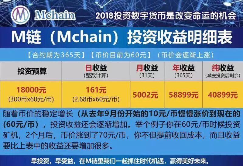 不过,区块链Truth(微信ID:chaintruth)发现,在M链的各个社群里,没有人讨论项目本身,大家似乎对M链基于以太坊ERC20发行的代币Mchain更感兴趣。以挖矿的名义,M链的推广者向新入局者许下了美好的承诺——投资6000元,一年赚回16800元;投资18000元,一年赚回58860元;投资180000元,一年赚回635100元。